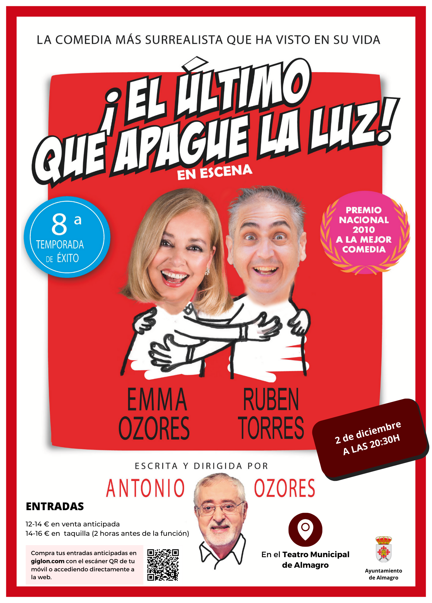 Representación de la comedia "¡El último que apague la luz!" escrita y dirigida por Antonio Ozores, representada por Emma Ozores y Rubén Torres y en colaboración con el Ayuntamiento de Almagro.