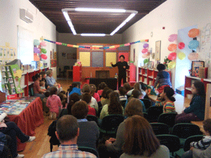 Tito Piruleta volvió ayer a Almagro para celebrar el Día de la Biblioteca con un cuentacuentos. Bajo el título Cuentos blancos en la maleta, Tito contó tres historias divertidas que hicieron reír a los más de treinta niños y niñas que se dieron cita