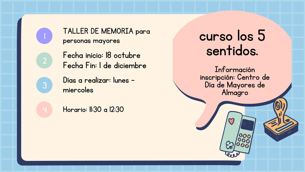 El centro de día de Mayores de Almagro organiza un taller de memoria para ejercitar los cinco sentidos. Precisamente con este título, todos los lunes y miércoles desde el 18 de octubre hasta el 1 de diciembre, los mayores participantes trabajar los sentidos a través de una variada programación de actividades. El horario es de 11:30 a 12:30h.
