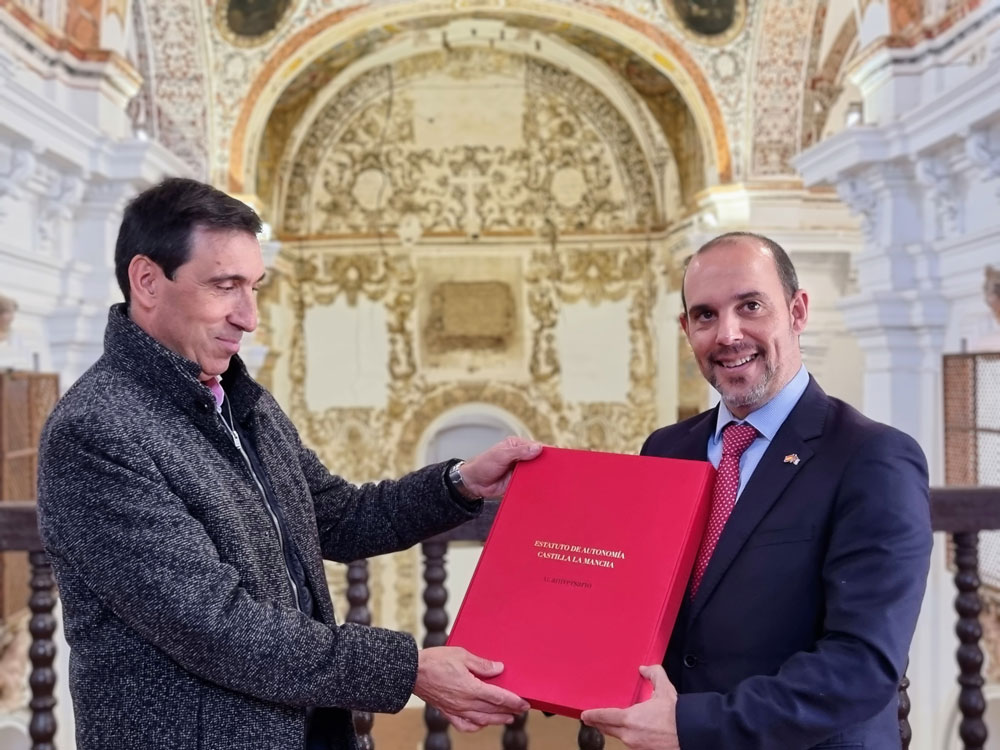 El presidente de las Cortes de Castilla-La Mancha, Pablo Bellido, ha hecho entrega este lunes de un ejemplar conmemorativo del 40 aniversario del Estatuto de Autonomía de Castilla-La Mancha al Ayuntamiento de Almagro, en la figura de su alcalde Daniel Reina, reconociendo así a la localidad manchega como escenario del hito fundacional del proyecto autonómico, al acoger en la iglesia de San Agustín el 11 de diciembre de 1978 el acto oficial de constitución de la Junta de Comunidades de Castilla-La Mancha, entonces como ente preautonómico.