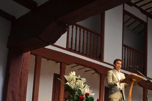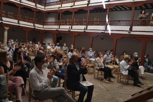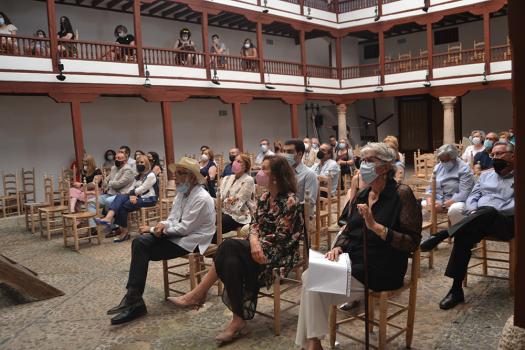 Daniel Reina ha manifestado su agradecimiento al autor de la obra escultórica y a Montserrat Rayo por su trabajo de recuperación de tan insigne almagreño. Durante su discurso, Reina también se ha alegrado de ver el patio y las galerías con gente para celebrar este día tan importante para Almagro que cambió el rumbo de la ciudad. Hoy somos lo que somos por la recuperación del Corral de Comedias en 1954, ha dicho. Ha terminado su discurso con el poema de la escritora Manolita Espinosa al Corral de Comedias que puede leer en su zaguán.