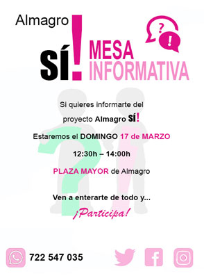 El próximo domingo, día 17 de marzo, la agrupación electoral Almagro Sí! va a instalar una mesa informativa en la Plaza Mayor de Almagro para explicar el trabajo político que ha llevado a cabo en el Ayuntamiento durante estos últimos cuatro años como agrupación Almagro Sí Puede.