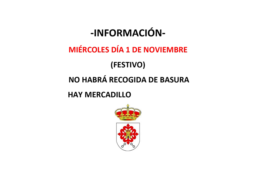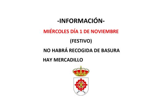Con motivo del día festivo, 1 de noviembre, el Ayuntamiento informa de que NO habrá recogida de basura pero SÍ HAY mercadillo.