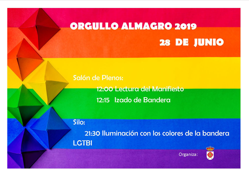 Almagro vuelve a conmemorar el Día del Orgullo Gay. El acto, que tendrá lugar en el Salón de Plenos del Ayuntamiento, consistirá en la lectura de manifiesto y posterior izada de la bandera que representa al colectivo LGTBI (Lesbianas, Gays, Bisexuales y Transexuales) con los colores del arcoíris. Será a las 12 horas de este próximo viernes.