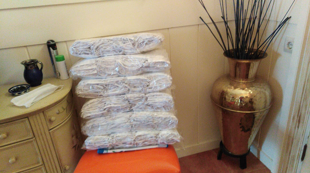 Las mascarillas se han realizado con material TNT 70, tejido no tejido (fibras) con una densidad de 70 en doble capa, impermeable y transpirable, elaborado según las recomendaciones del Ministerio de Industria, Comercio y Turismo.