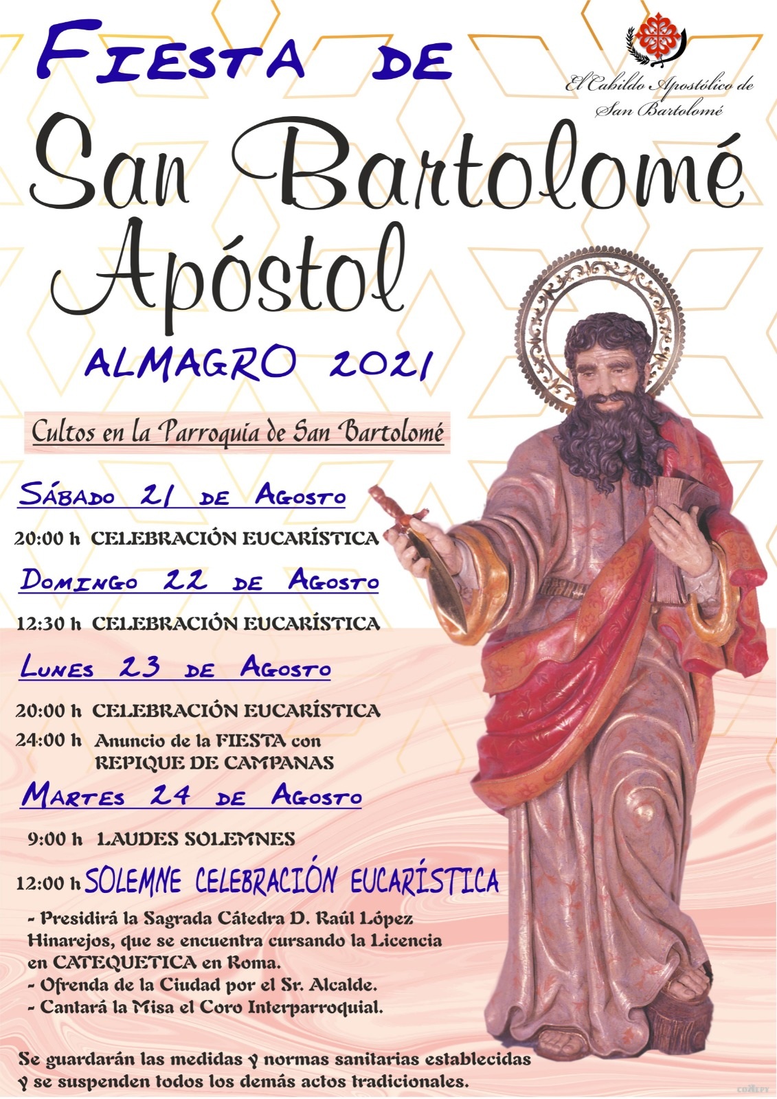 Las fiestas de Almagro en honor de San Bartolomé Apóstol comienzan este fin de semana. Como es habitual, el Cabildo Apostólico de San Bartolomé organiza los actos litúrgicos. Los cultos que tendrán lugar en la parroquia de San Bartolomé comienzan este sábado a las 20 horas. El domingo, será a las 12:30 horas y el lunes 23 de agosto la misa será a las 20 horas. Como es tradición, a las cero horas, las campanas de la iglesia repicaran anunciando la festividad del patrón de Almagro. La solemne misa será el martes 24 de agosto a las 12 horas.