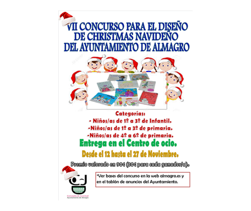 La Concejalía de Infancia del Ayuntamiento de Almagro abre el plazo de presentación del concurso para el diseño de Christmas navideño el jueves 12 de noviembre. Este año, se han establecido tres categorías, abriendo la convocatoria a los más pequeños de Educación Infantil. La primera categoría es para los niños de 1º a 3º de Infantil; la segunda de 1º a 3º de Primaria y una última para los niños de 4º a 6º de Primaria. El Christmas ganador será utilizado de manera oficial por el Ayuntamiento de Almagro como felicitación navideña. El jurado valorará especialmente la originalidad, creatividad y representatividad del Christmas. El fallo se conocerá el 10 de diciembre. Las propuestas se presentarán en un sobre cerrado que deberá contener los trabajos en tamaño Dina-4 junto con los datos del participante inscritos en el reverso y la entrega se realizará en el centro de ocio desde el 12 de noviembre hasta el 27 de noviembre. El premio está valorado en 90 euros, 30 euros para cada ganador de las tres categorías.
