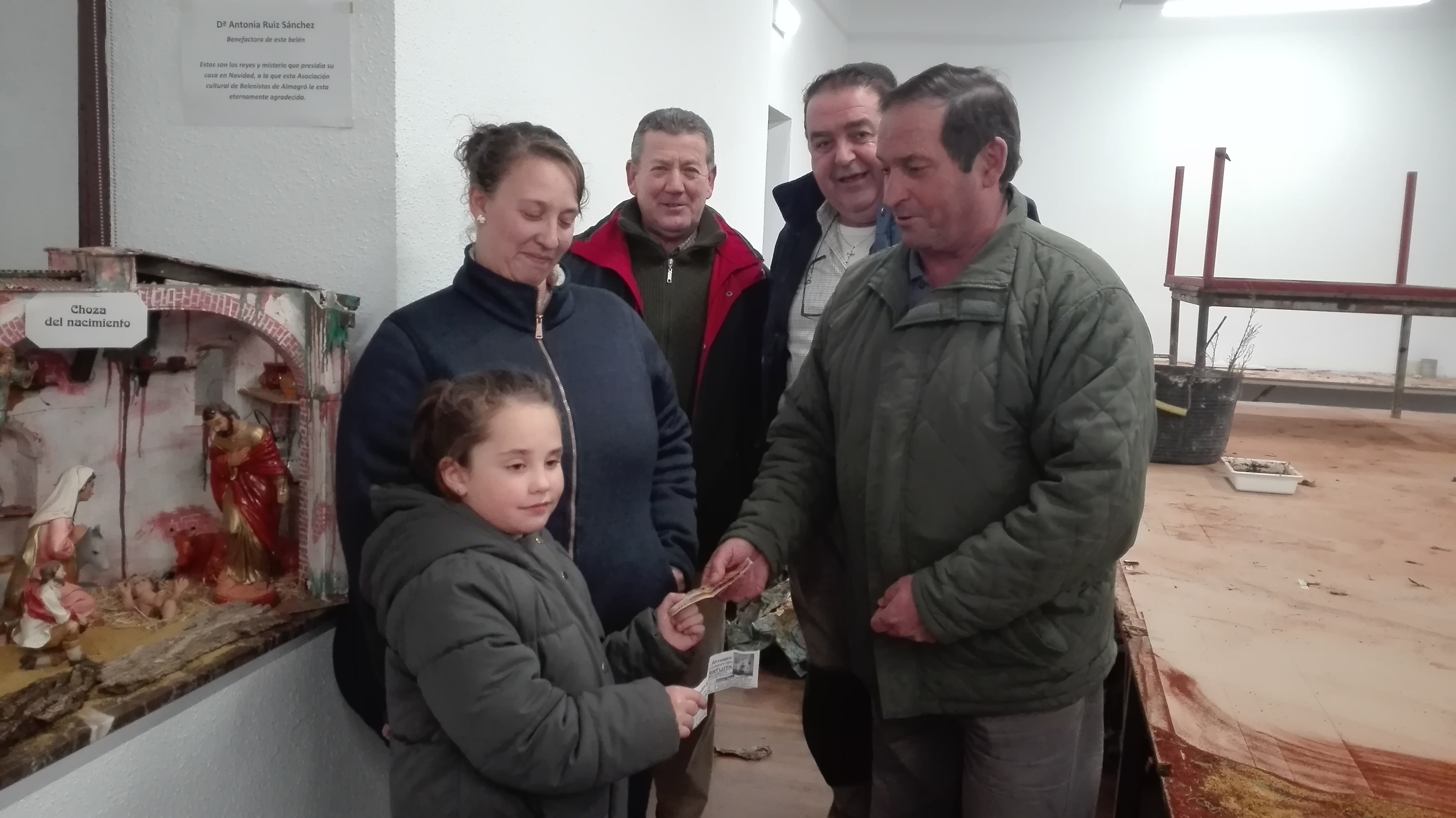 La niña almagreña Carla Naranjo Asensio recibió en la noche de ayer, el premio de 100 euros que la asociación de Belenistas de Almagro otorga al finalizar la Navidad. Desde hace varios años, la asociación entrega a cada persona que visita el Belén Municipal una entrada con el fin de contabilizar el número de personas que a lo largo de toda la Navidad visitan el Belén. Este año han pasado casi 4.400 personas. La entrada es también una papeleta para el sorteo de 100 euros coincidiendo con el sorteo la Lotería Nacional del 12 de enero. En esta ocasión, el 1.109 fue el número ganador.
