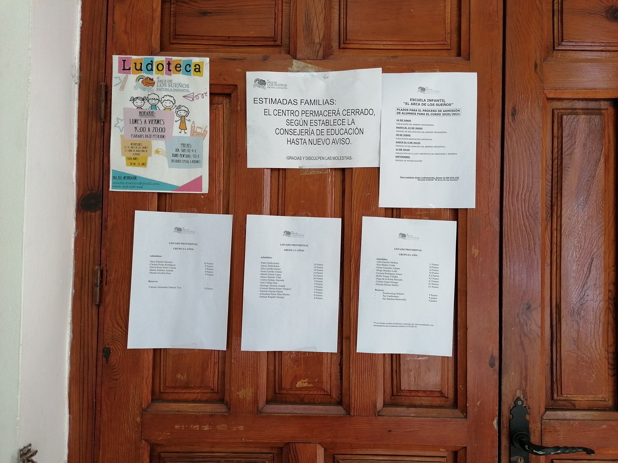 La escuela infantil “El arca de los sueños” ha publicado esta semana la lista provisional de admitidos de alumnos para el próximo curso. La información está colgada en la puerta de la guardería que permanece cerrada desde el decreto del estado de alarma.