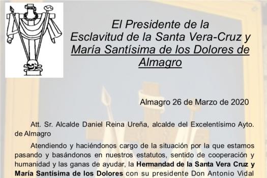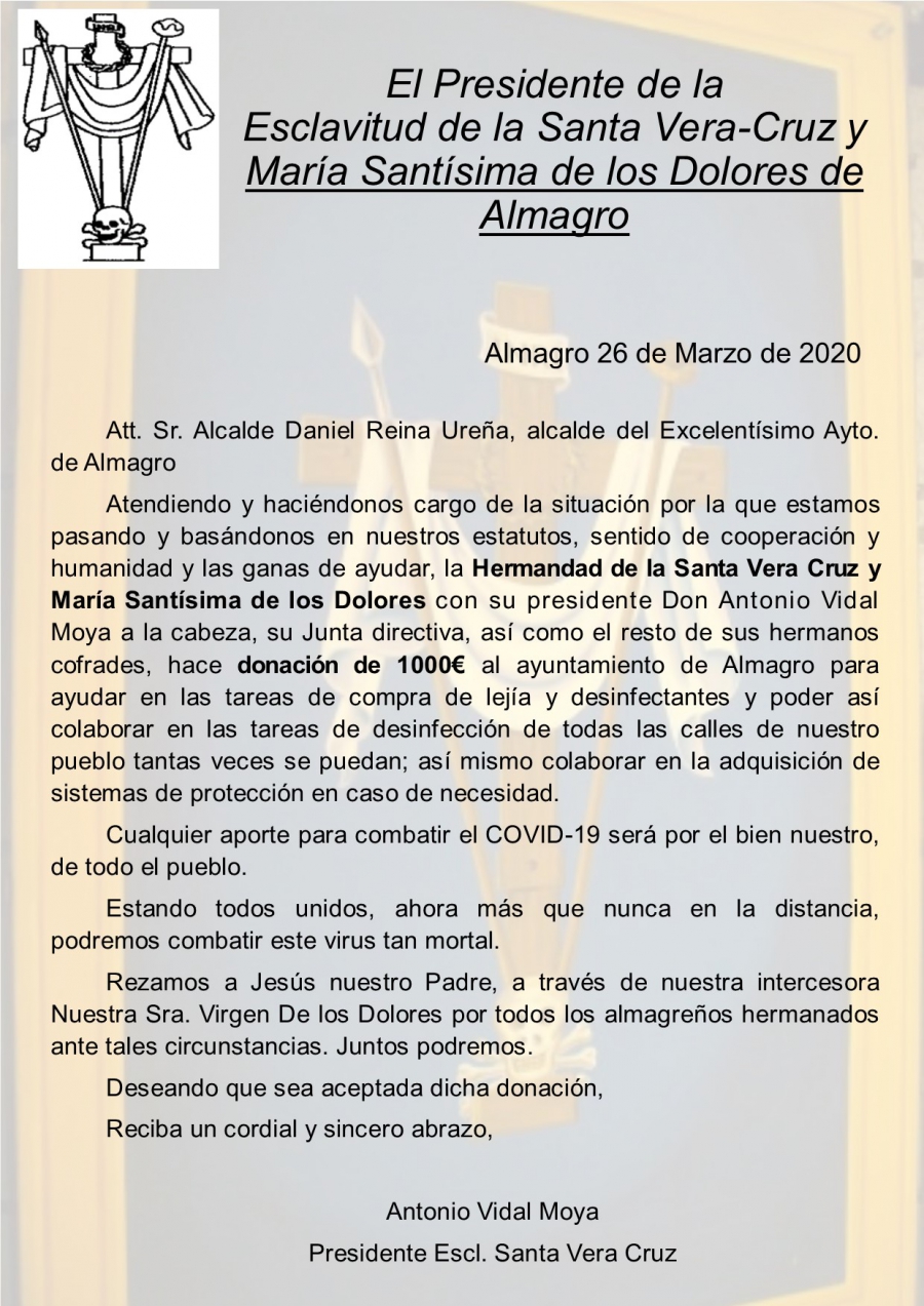 La Hermandad de la Santa Veracruz ha donado 1.000 euros al Ayuntamiento de Almagro para que los utilice en lo que necesite para la lucha contra el COVID-19 compra de material de protección, productos químicos de limpieza… lo que sea necesario. La directiva de la Hermandad mantuvo una reunión, por wasap, hace unos días para proponer que el dinero que tenían presupuestado para los gastos de Semana Santa se done al Consistorio encajero. Su presidente Antonio Vidal ha explicado a través de Onda Almagro que quieren ayudar en todo lo que puedan para combatir el coronavirus.” somos una hermandad pequeña, pero con un granito de arena hacemos un cerro,”. Los 1000 euros regalados estaban destinados a la compra de velas, flores y de todos esos gastos de poner en la calle sus procesiones y llevar a cabo sus actos relacionados con y durante la Semana Santa 2020 que como todos sabemos se ha suspendido en todo el territorio español.
