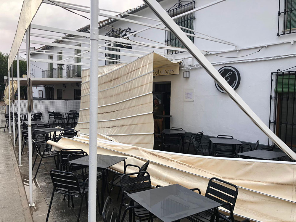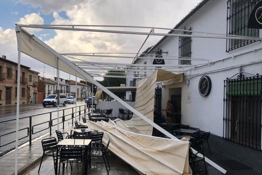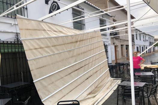 El agua entró en la ermita de San Juan, arrancó una rama de un árbol del jardín de la Antigua Universidad Renacentista, voló el toldo de un restaurante y provocó daños eléctricos