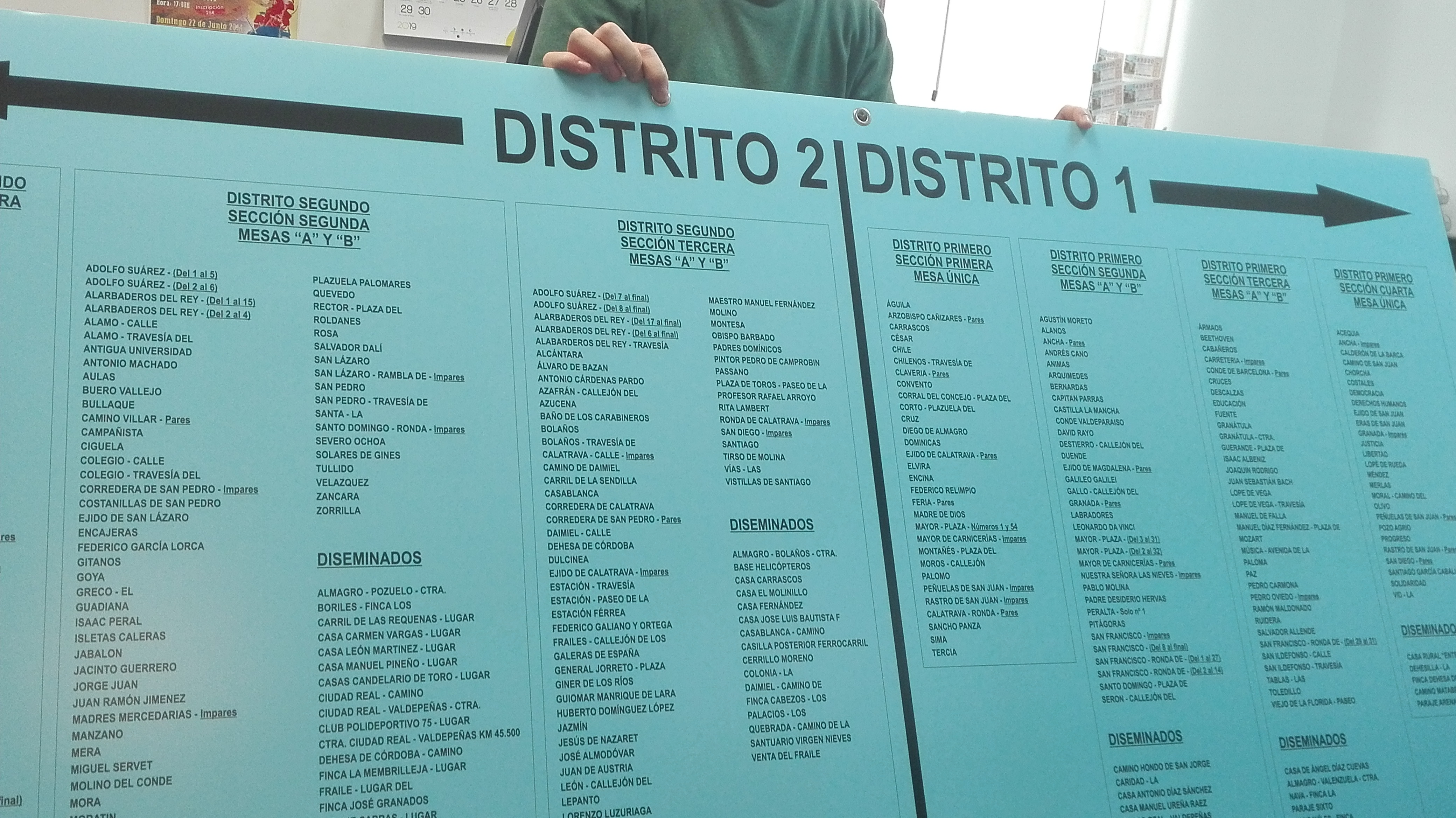 Para facilitar el voto, el Ayuntamiento ha instalado un gran panel a la entrada de colegio en el que se muestra las calles adscritas a cada una de las once mesas electorales. Para estas Elecciones, algunas calles han cambiado de mesa electoral con el fin de que la distribución de votantes fuera más equitativa. Había mesas con una diferencia importante de votantes respecto a otras. Cada votante ha recibido en su casa la tarjeta censal en la que se especifica cual es la mesa en la que se vota.