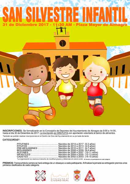 Almagro volverá a despedir el año uniendo buen humor, alegría y deporte gracias a la popular carrera San Silvestre. En la mañana del 31 de diciembre serán los más pequeños quienes entrarán en acción en la Plaza Mayor desde las 11:30, en una prueba que si bien es de carácter participativo, en el caso de las carreras infantiles repartirá premios a los mejores de cada categoría, y obsequios a todos los inscritos.