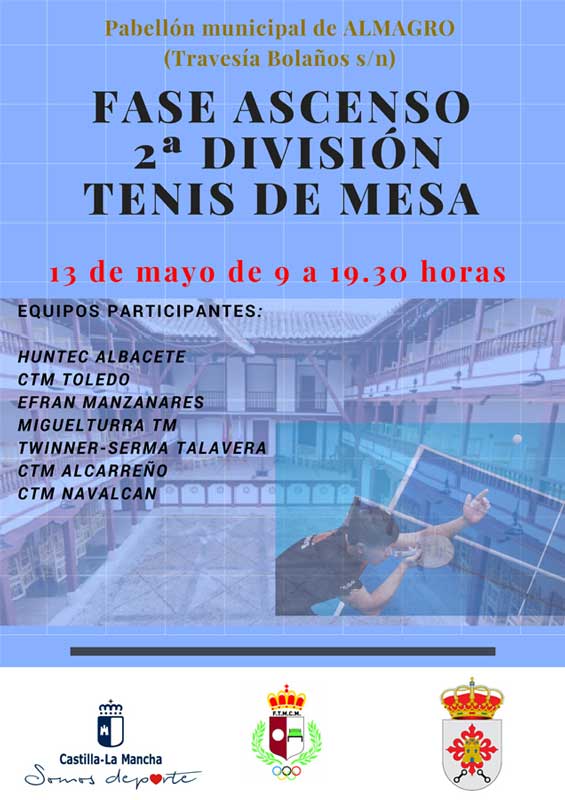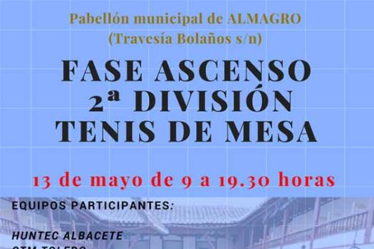 Almagro ha sido elegida por la Federación de Tenis de Mesa de Castilla-La Mancha como sede de celebración de la Fase de Ascenso a 2ª División Nacional. Será este domingo cuando los siete mejores equipos regionales de la Súper Liga Manchega pelearán por hacerse con una de las tres plazas nacionales que corresponden a Castilla-La Mancha. Los cuatro primeros clasificados en cada uno de los dos grupos de Súper Liga Manchega se han ganado el derecho a buscar el ascenso, aunque finalmente serán solo siete los participantes en Almagro. Así pues, el CTM Toledo librará la ronda de cuartos de final, en la que se enfrentarán en la mañana del domingo Huntec Albacete frente a CMT Alcarreño, Efran Manzanares frente a CTM Navalcán, y Miguelturra TM frente a Twinner Serma Talavera.