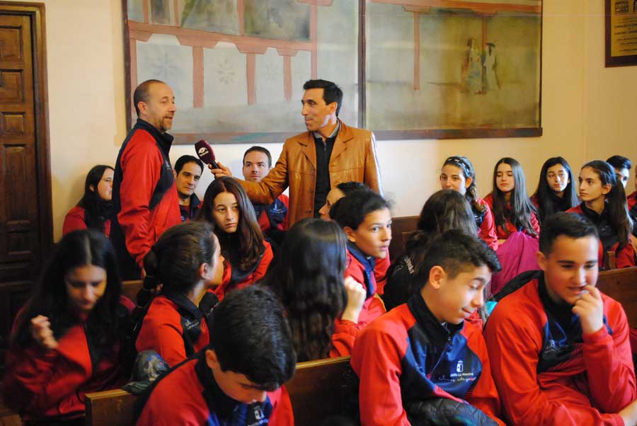 El almagreño Domingo González es el jefe de la expedición manchega formada por 47 personas entre deportistas y técnicos. Tras la recepción oficial y como ya es habitual, pudieron fotografiarse en el Corral de Comedias y en la Plaza Mayor de Almagro. Mañana martes pondrán rumbo a Valladolid, donde el miércoles arranca la pelea por el título nacional. Reina, que ejerció de improvisado periodista preguntando micrófono en mano a técnicos y jugadores, deseó suerte a los equipos e insistió en que “tendréis a vuestra disposición las instalaciones de Almagro siempre que las necesitéis, para nosotros es un placer acogeros aquí”.
