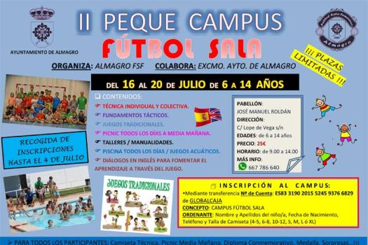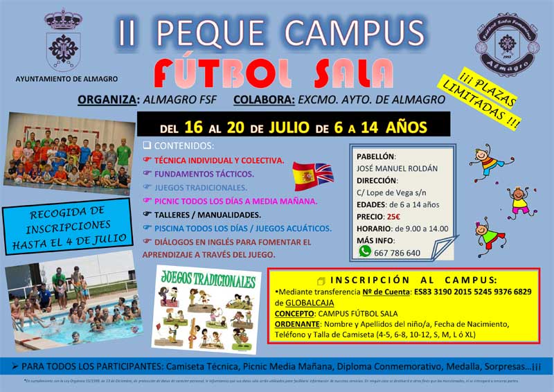 La segunda edición del Peque Campus de Fútbol Sala para niños y niñas de 6 a 14 años tendrá lugar en el pabellón José Manuel Roldán del 16 al 20 julio en horario matinal (de 9 a 14 horas), ofreciéndose actividades y entrenamientos de técnica individual y colectiva, fundamentos tácticos, juegos tradicionales, picnic a media mañana, talleres, manualidades, piscina a diario con juegos acuáticos, y diálogos en inglés para fomentar el aprendizaje a través del juego. El precio de inscripción es de 25 €, incluyéndose además una camiseta técnica. Los interesados pueden obtener más información en el 667786640.
