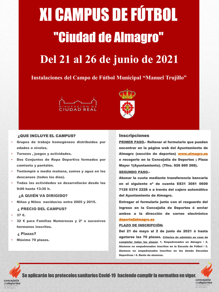 El próximo lunes 24 de mayo se abre el plazo de inscripción para XI el campus de fútbol “Ciudad de Almagro”. La concejalía de Deportes informa que se desarrollará del 21 al 26 de junio en horario de mañana, de 9 a 13.30h. Este es uno de los cambios introducidos en la organización del campus como medida de prevención ante la COVID-19. Años anteriores, el campus se desarrollaba durante toda la jornada en horario de mañana y tarde.