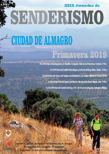 La Concejalía de Deportes presenta una nueva edición de Jornadas de Senderismo Primavera de Almagro. Serán 6 rutas por diferentes parajes y paisajes de las provincias de Toledo, Jaén y Córdoba, Ciudad Real y Málaga. Estas XXIX Jornadas comenzarán el domingo 10 de marzo en la pequeña aldea de Conquista, en el Valle de los Pedroches cordobés punto de partida de dos rutas por los alrededores de la localidad, la ruta del Navalagrande y la ruta de El Salcedillo.