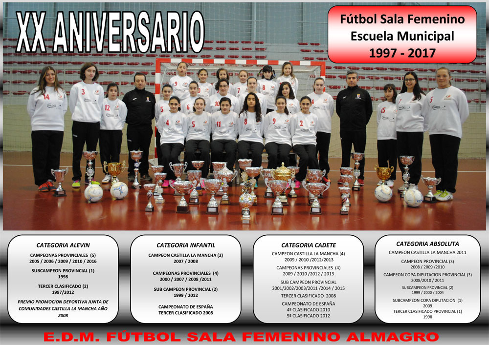 La Escuela Municipal de Fútbol Sala Femenino de Almagro cumple este 2017 dos décadas de vida. Fue en 1997 cuando Manolo Arévalo se hizo cargo del primer grupo de niñas que querían jugar al fútbol sala en la ciudad. Aquella fue la primera piedra de un proyecto que fue consolidándose año tras año hasta conseguir, con mucho esfuerzo y trabajo, ser la escuela de referencia en Castilla-La Mancha en este deporte. Los números son muy claros: 43 veces entre las tres mejores a nivel provincial, regional y nacional en diferentes categorías, 16 campeonatos provinciales y 7 títulos regionales. Sin olvidarnos del bronce en el Campeonato de España Infantil de 2008, que valió a la Escuela de Fútbol Sala Femenino para recibir el Premio Promoción Deportiva de la Junta de Comunidades de Castilla-La Mancha.