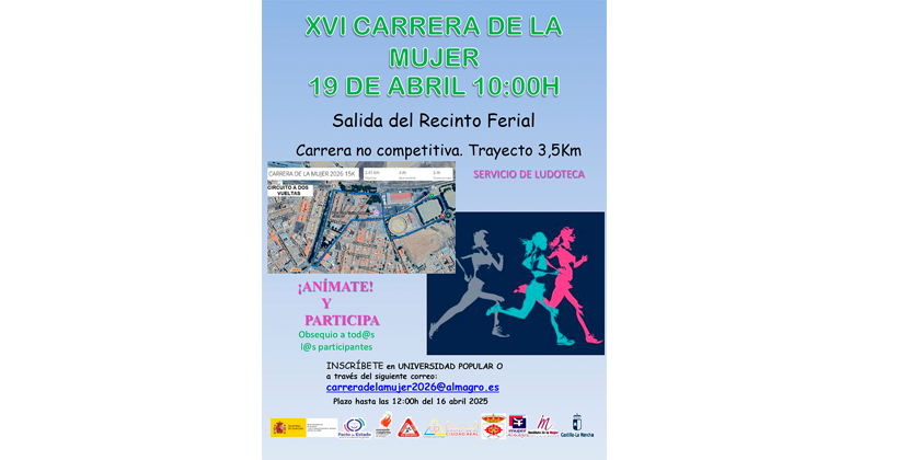 El periodo de inscripción ya está abierto y permanecerá hasta el 16 de abril a las 12:00 h. Las inscripciones pueden formalizarse presencialmente en la Universidad Popular de Almagro o por correo electrónico en carreradelamujer2026@almagro.es