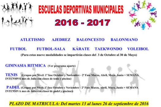 Un total de doce disciplinas dan forma a la nueva oferta deportiva lanzada por la Concejalía de Deportes dentro de las Escuelas Deportivas Municipales: Atletismo, Ajedrez, Baloncesto, Balonmano, Fútbol, Fútbol Sala, Gimnasia Rítmica, Kárate, Pádel, Taekwondo, Tenis y Voleibol. En el caso de la Escuela de Gimnasia Rítmica, cabe destacar que al igual que el pasado año será gestionada directamente por un club especializado en esta disciplina, el Club Rítmica Ros, dirigido por quien fuera coreógrafa de la selección española Fuensanta Ros. Es por ello que desde la Concejalía de Deportes facilitarán la información a los padres interesados pero tendrán que contactar directamente con este club.