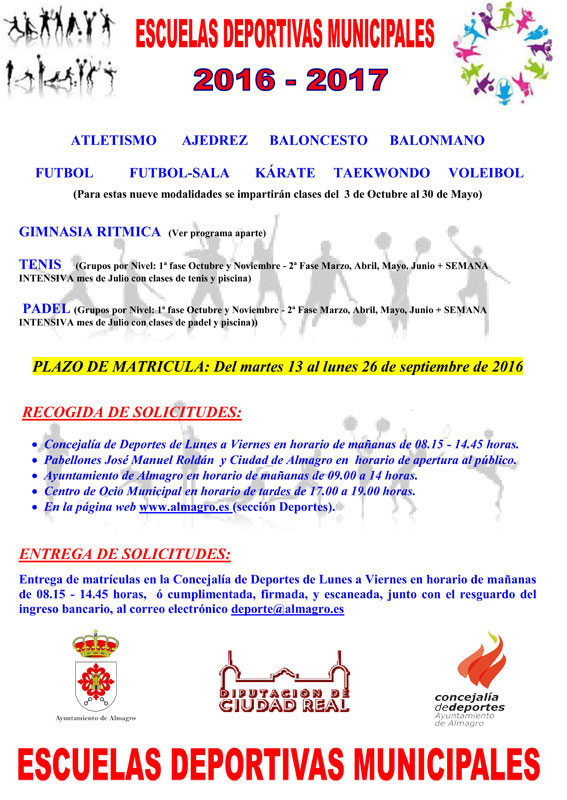 La entrega de solicitudes se debe efectuar en la Concejalía de Deportes de lunes a viernes en horario matinal de 8:15 a 14:45 horas, o bien enviarla al mail deporte@almagro.es debidamente cumplimentada, firmada y escaneada junto al justificante de pago. Las clases comenzarán el lunes 3 de octubre.