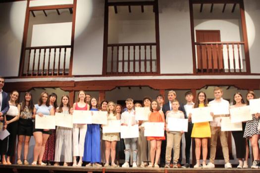 Después, subieron los mejores estudiantes del instituto Antonio Calvín con su director Miguel Cecilio Gómez, que se despide su mandato en la dirección del centro y de Almagro: Lucía de la Rubia Arroyo (2ºESO); Ángel López Díaz (4º ESO); Juan Manuel Grande Ruiz (ciclo formativo de Grado Superior de Administración; Francisco Javier Barba Cervantes (ciclo formativo de Grado Superior de Diseño y Amueblamiento); Ignacio Romero Torres (2º Bachillerato de Ciencias) y Aitana Pedrero Canuto (2º Bachillerato de Humanidades y Ciencias Sociales)