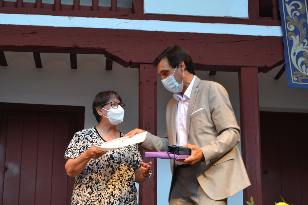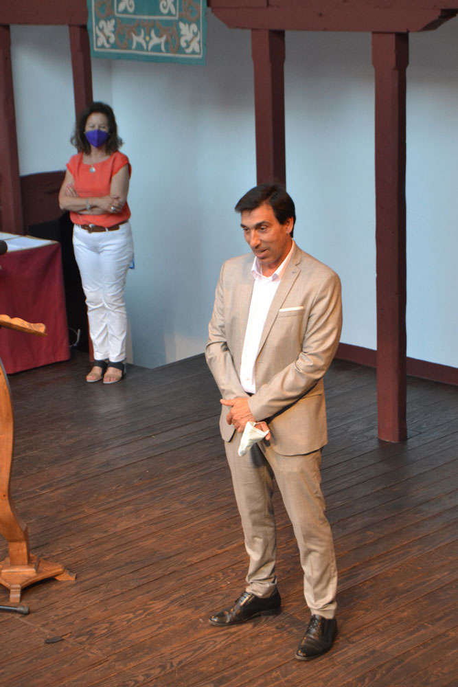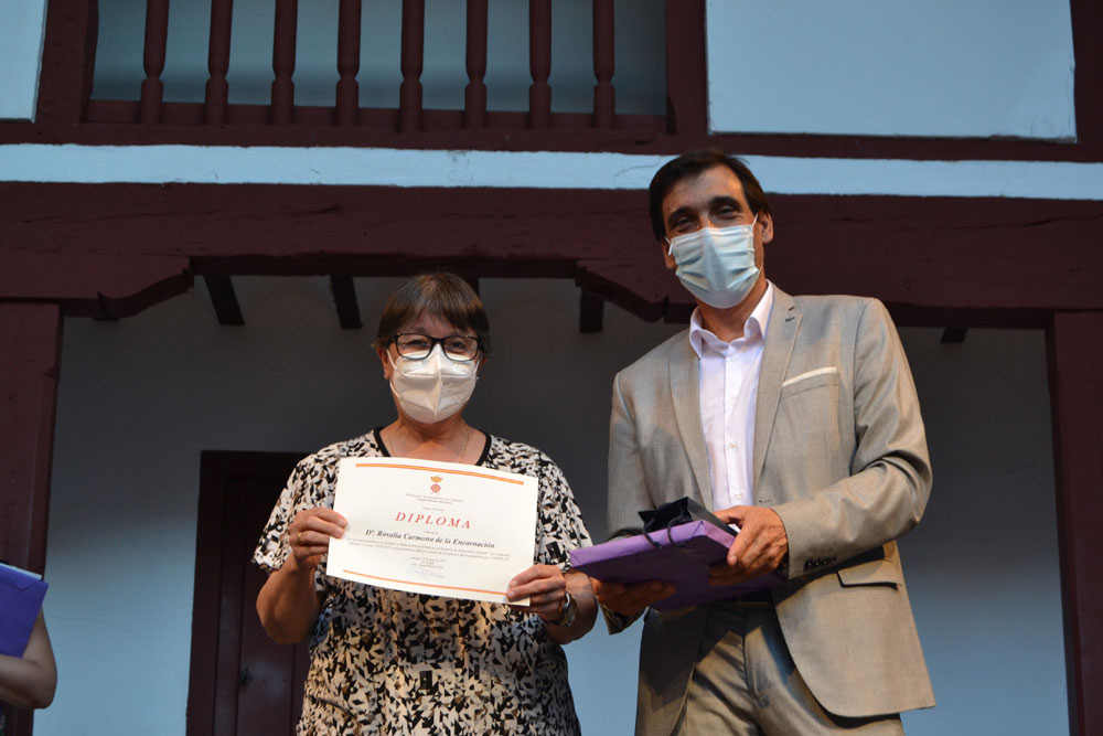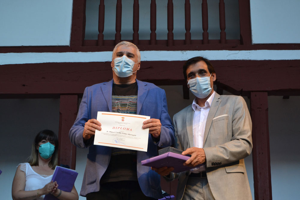 La sorpresa llegó después. El concejal de Cultura, Dionisio Muñoz, se sumó a las palabras de agradecimiento del alcalde hacia los equipos docentes por la labor desarrollada durante este complicado curso de distanciamiento, confinamientos, protocolos cambiantes… Por ello, pido a los seis directores de los centros educativos públicos – colegio Diego de Almagro, Miguel de Cervantes, Paseo Viejo de la Florida, Escuela Infantil La Comedia, Instituto Clavero Fernández de Córdoba e Instituto Antonio Calvín-, así como un representante de la escuela municipal de música, subir al escenario para recibir el cariño y agradecimiento con la entrega de un diploma, obsequio del libro del cronista de Almagro, Arcadio Calvo y un bolígrafo personalizado.