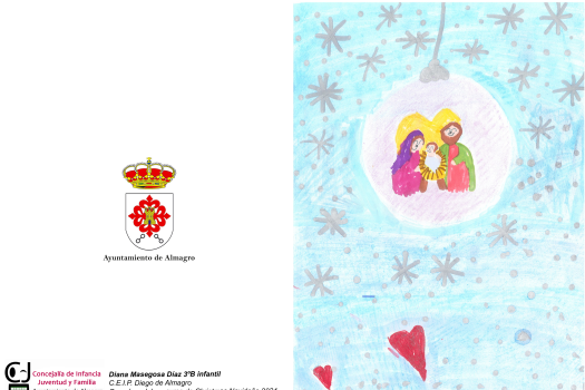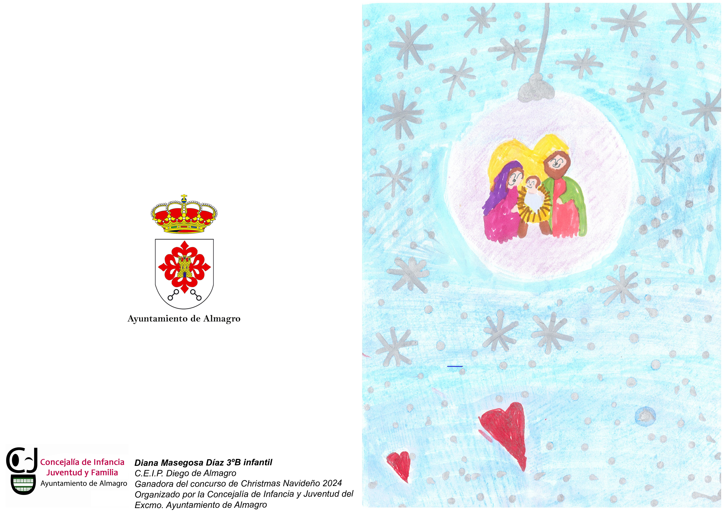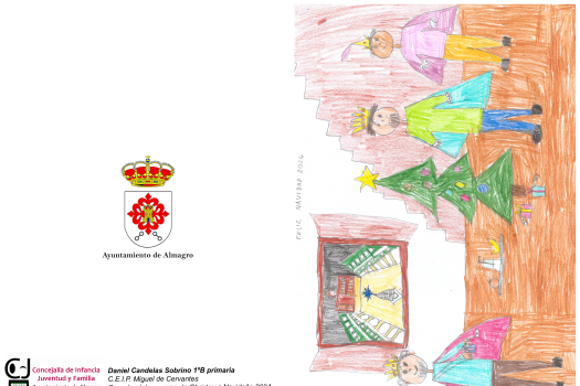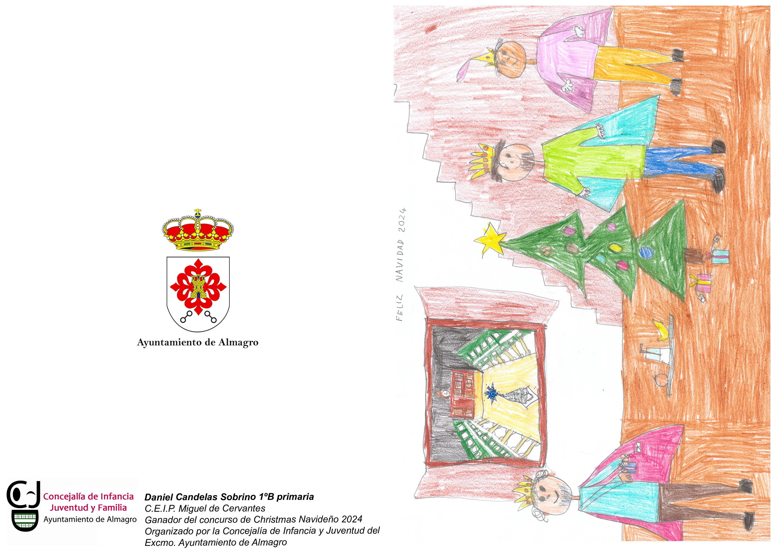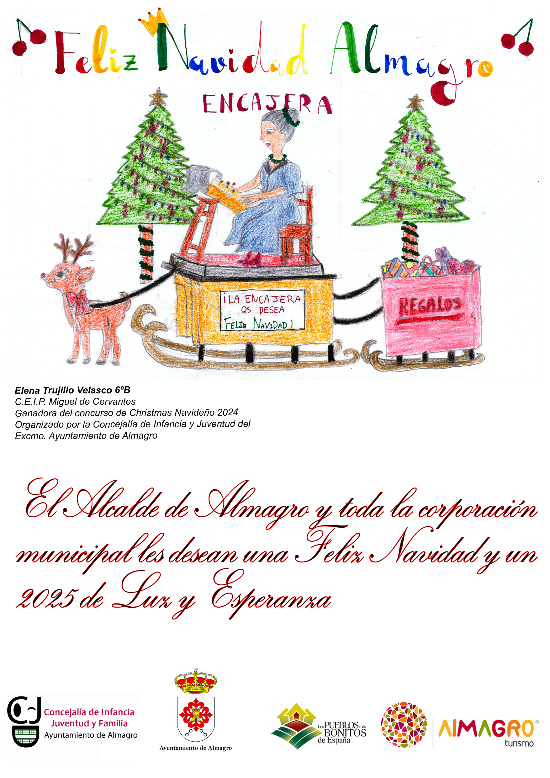 El Ayuntamiento felicita estas fiestas navideñas con las imágenes de un original trineo tirado por una encajera, los Reyes Magos en un salón de una casa almagreña y del Nacimiento de Jesús. Son los personajes representados en los tres dibujos ganadores del concurso de Christmas, organizado, un año más, por la Concejalía de Familia, Infancia y Juventud.