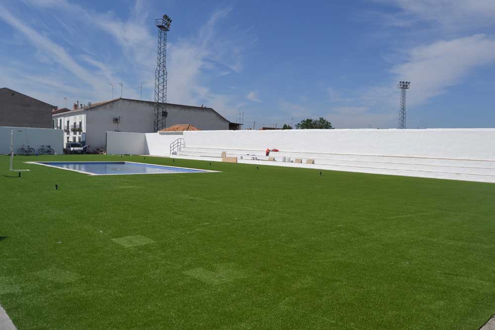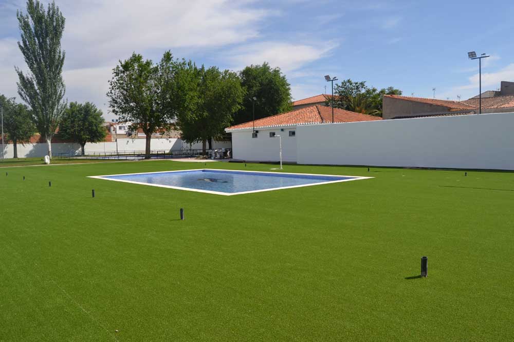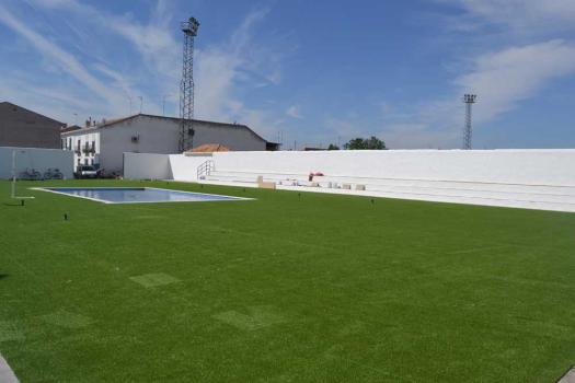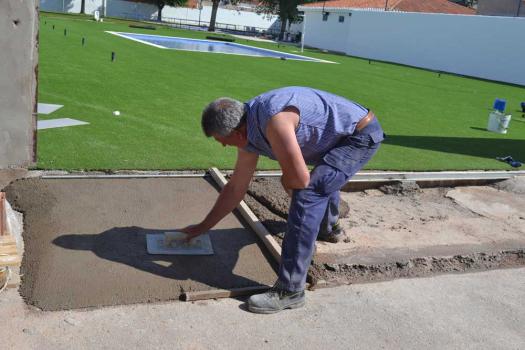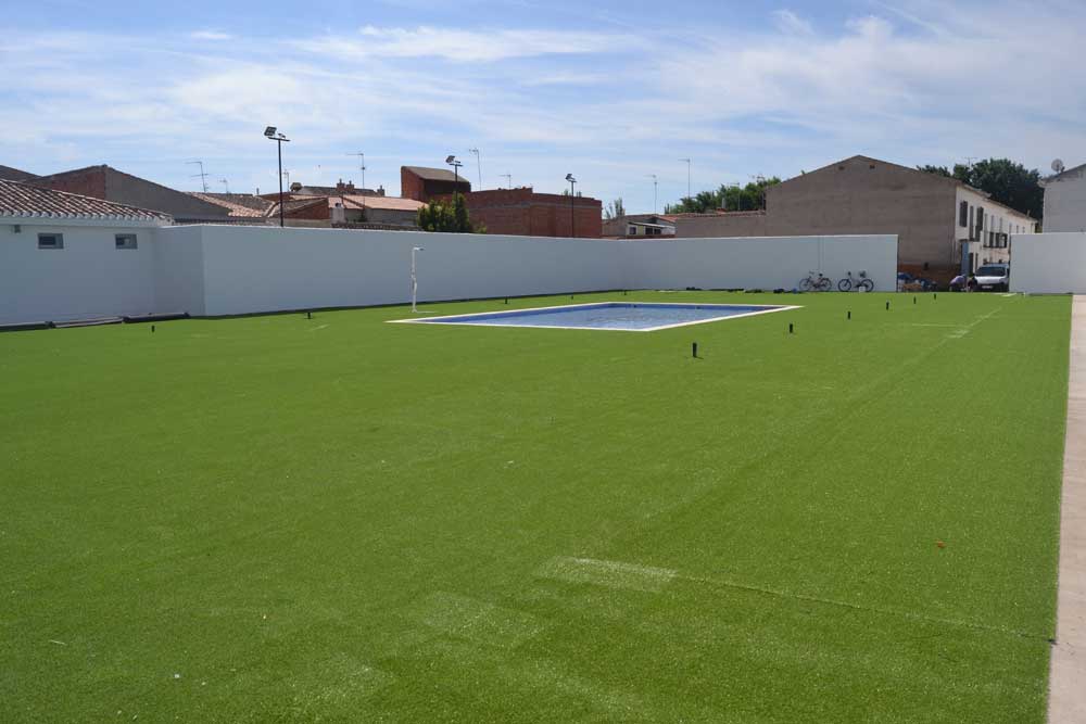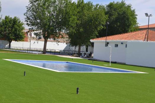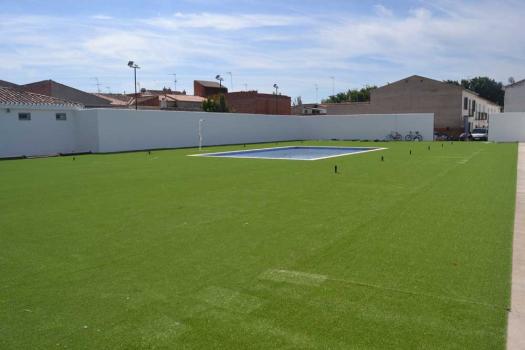 La nueva zona de piscina infantil municipal está casi finalizada. Operarios del Ayuntamiento realizan esta semana los últimos trabajos que consisten en la instalación del césped artificial y de una pérgola como zona de sombra donde estaba la anterior piscina infantil. La nueva piscina infantil es de mayores dimensiones y cuenta también con una amplia zona verde.