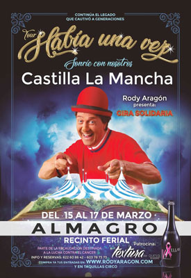 El circo de uno de los payasos de la tele llega este fin de semana a Almagro. Rody Aragón, el hijo pequeño de Fofó ha continuado con el legado de su familia con el tour “Había una vez”. El espectáculo, en el que no faltarán las famosas canciones que han cantado varias generaciones de niños, se enmarca dentro de una gira solidaria que recorrerá Castilla-La Mancha. Rody Aragón ha querido que parte de la recaudación se destine a la lucha contra el cáncer.
