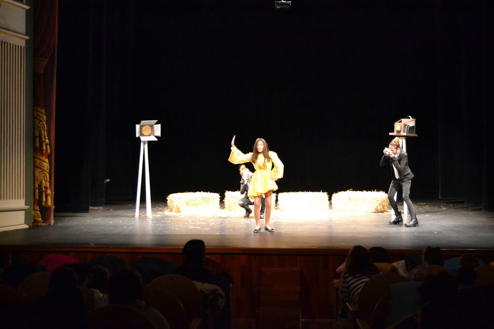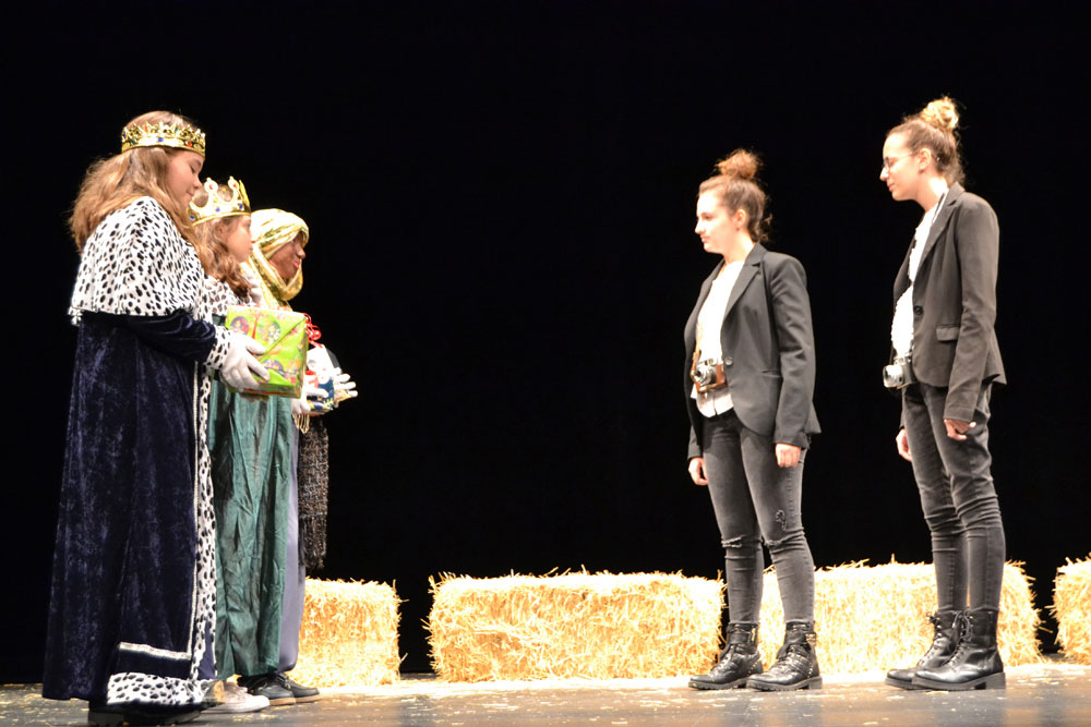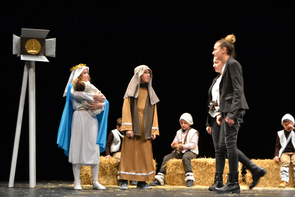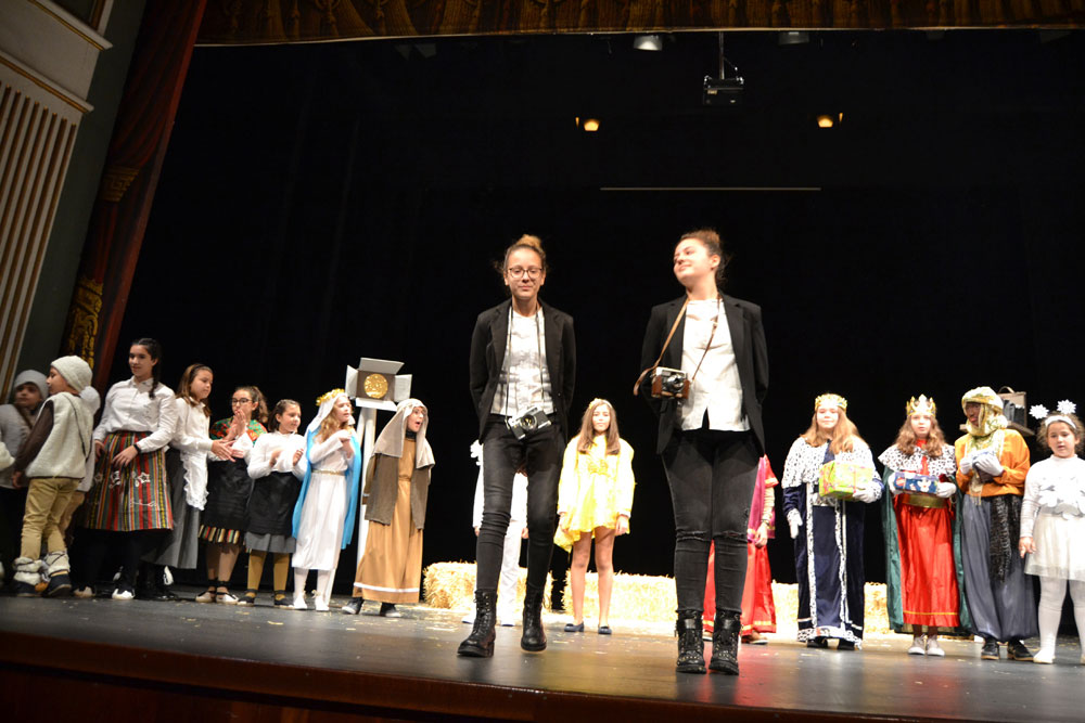 Los niños que participan en el taller de teatro de los centros educativos de Almagro volvieron ayer a recibir el cariño del público con una gran ovación en todas sus representaciones teatrales. En esta ocasión, la veinteina de alumnos con edades comprendidas entre los 6 y los 14 años, llevaron a escena todos los personajes que configuran un belén. Beatriz Naranjo, la monitora del taller, presentó una original propuesta “Un selfie en Navidad”. Así, poco a poco, todas las figuras que dan vida a cualquier belén, fueron saliendo al escenario para formar parte de esa foto que dos jóvenes fotógrafas querían inmortalizar para esta Navidad 2019. Pastores, que les gustaba jugar con la paja del belén, posaderas, la Virgen, el niño y San José, la estrella, los Reyes, tanto los Magos como Herodes… fueron apareciendo sobre las tablas del Teatro Municipal haciendo disfrutar y en muchos casos reír a los asistentes. Fueron muchas las risas a escuchar al rey Baltasar que, en lugar de ofrecer mirra, llevó al pequeño chocolate pero eso sí…. Pensado para los padres. También fueron muy aplaudidos los copitos de nieve que no podía faltar en esta representación del Nacimiento de Jesús. Y bueno… como los tiempos han cambiado… al final de la obra, salieron tres enfermeras que al oír el llanto de Jesús no dudaron en ayudar a calmar su lloro.