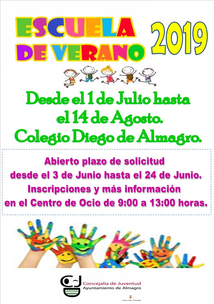 La Concejalía de Infancia abre el próximo lunes, 3 de junio el plazo de inscripción de las actividades infantiles para los meses de julio y agosto. Concretamente, la Escuela de Verano comenzará el 1 de julio y finaliza el 14 de agosto y tendrá lugar en el colegio Diego de Almagro. Las actividades se han organizado por quincenas como en años anteriores y con la posibilidad de elegir el horario más adecuado para el niño participante. La Escuela de Verano que se desarrolla durante todo la mañana de 9 a 14 horas, pero los padres tienen la opción del Aula de Verano, es decir, dejar a sus hijos en horario más reducido de 11 a 14 horas.