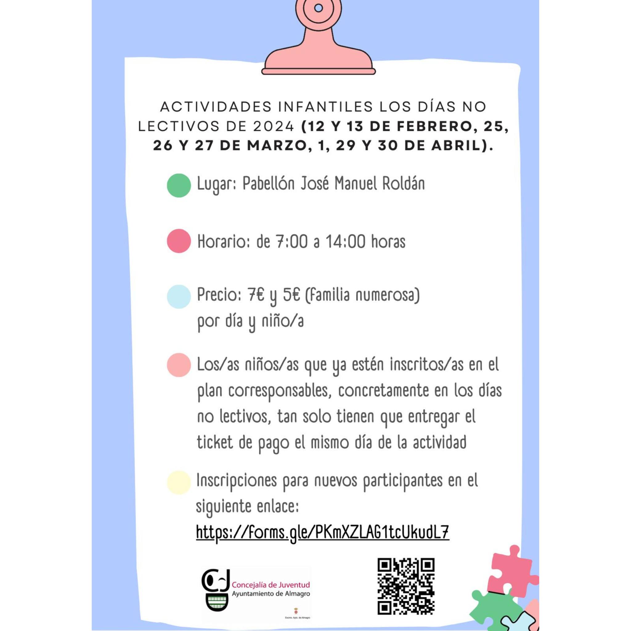 El Ayuntamiento de Almagro, a través de la Concejalía de Infancia, Juventud y Familia, ha preparado diferentes actividades infantiles para los días no lectivos del 2024 (12 y 13 de febrero, 25, 26 y 27 de marzo, 1, 29 y 30 de abril) en el Pabellón José Manuel Roldán, con el objetivo de facilitar la conciliación en las familias almagreñas.