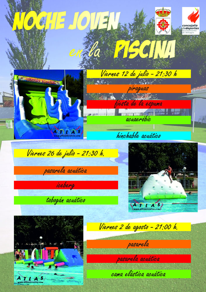 La actividad lúdica por la noche vuelve este viernes a la piscina municipal. A partir de las 21:30 horas, el recinto se abrirá para divertirse también en el agua. Así, este viernes, niños y jóvenes podrán disfrutar de piraguas e hinchables acuáticos. También habrá una fiesta de la espuma y acuaerobic. “La Noche Joven en la piscina” se repetirá el viernes 26 de julio y el viernes 2 de agosto.