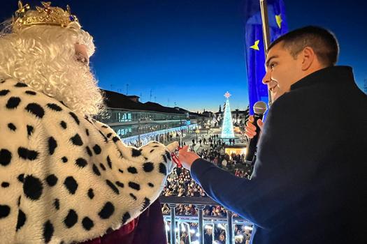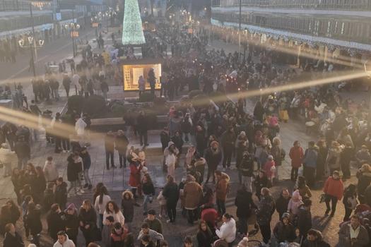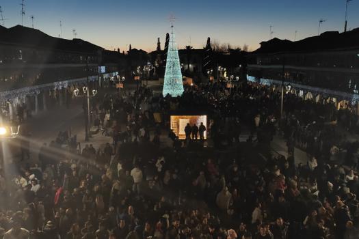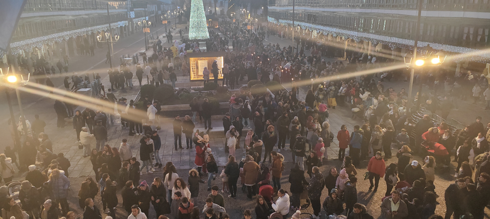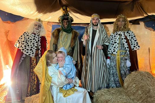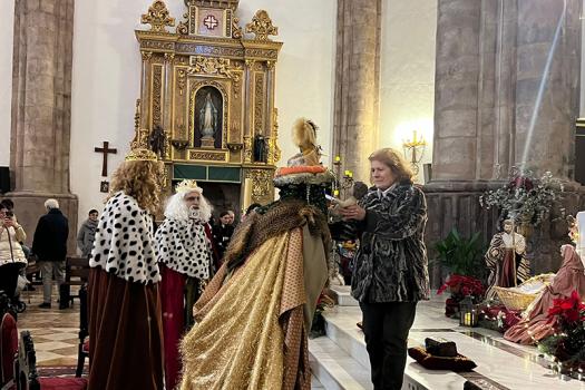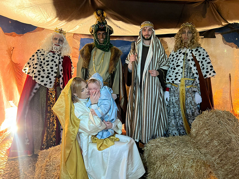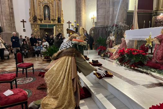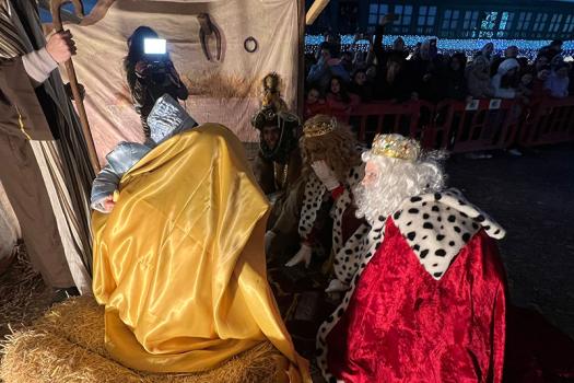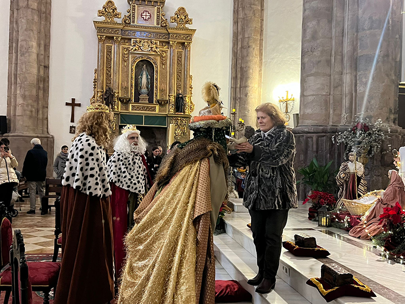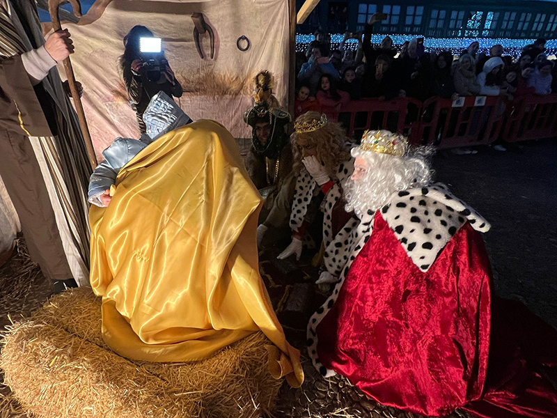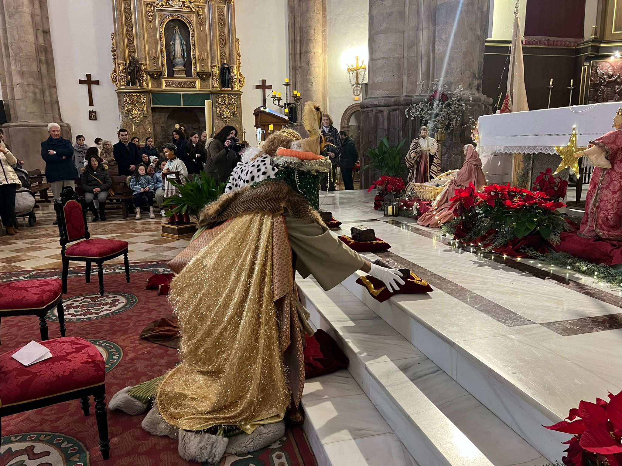 Los Reyes Magos siguieron su visita por Almagro hasta la iglesia Madre de Dios para revivir el momento de la Adoración que relata el evangelio, según San Mateo. Tras esta especial parada, novedad en el itinerario de los sus Majestades en Almagro, los tres Reyes llegaron caminando a la Plaza Mayor donde les esperaban muchos niños y una representación de lo que debió ser el instante en que los reyes de Oriente visitaron al recién nacido, Jesús. En esta ocasión, sus Majestades iban guiado en su camino hacia el portal de Belén por la luz de las antorchas de sus pajes.