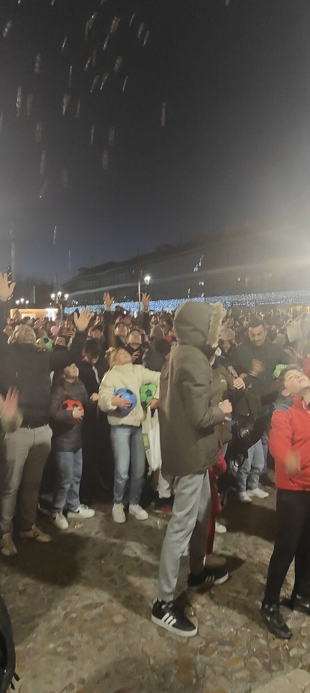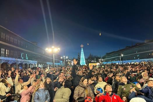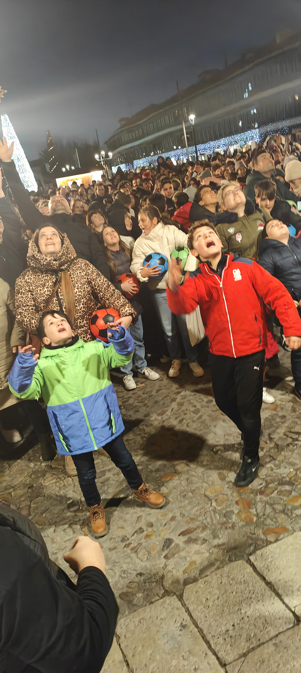 Tras lanzar cientos de caramelos blandos y balones desde el balcón del Ayuntamiento, los tres Reyes Magos subieron cada uno a un coche antiguo para seguir repartiendo ilusión y emocionando a pequeños y mayores durante su recorrido por la Plaza Mayor.