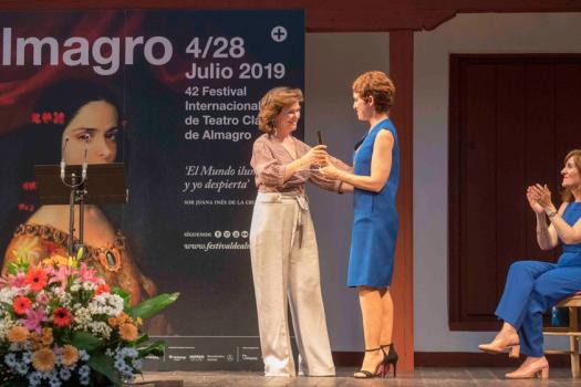 Adriana Ozores ha recibido el XIX Premio Corral de Comedias. Un premio del que reconoció nada más recibirlo, hacerle una enorme ilusión porque le devuelve a su pasado. A esos años felices en Almagro con la Compañía Nacional de Teatro Clásico, con Adolfo Marsillach, Carlos Hipólito, Jesús Puente, Aitana Sánchez-Gijón…. La actriz, vinculado al Siglo de Oro estrechamente entre 1988 y 1996 compartió anécdotas y recuerdos, los camerinos de tela, las gallinas, el suelo de tierra del Hospital de San Juan: “Éramos una tribu y recuerdo nuestras mañanas en la piscina, los ensayos, las cenas y noches eternas bajo las estrellas de Almagro”. Habló con mucho cariño de Almagro y del Festival donde se topó con el teatro en mayúsculas de la mano de la CNTC: “Soy lo que soy como actriz y como persona por esos años en la Compañía Nacional de Teatro Clásico (CNTC) y por esos veranos en Almagro”. Finalizo su intervención con estas palabras: “El premio me ha sabido a gloria”.