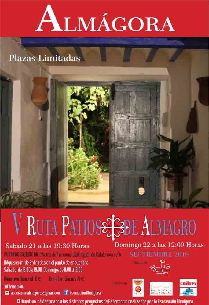 La ruta guiada de patios es una de las actividades anuales de Almágora con mayor demanda y de las más esperadas por almagreños y visitantes. Permite conocer la Historia de Almagro desde otra perspectiva, desde sus patios que en la mayoría de los casos no son visitables. Almágora consigue que estos espacios, en su mayoría, en manos privadas, se abran al público por unas horas. Este fin de semana será la quinta ruta. Se ha organizado, con en otras ocasiones, en dos momentos. La primera ruta está prevista el sábado a las 19.30 horas con salida desde la oficina de turismo en el centro recepción de visitantes. La segunda ruta, con el mismo recorrido, será el domingo a las 12 horas.