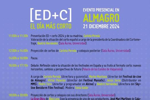 El evento presencial ED+CORTO 2024 tendrá lugar este año en la localidad de Almagro. El Día más Corto [ED + C] que se celebra todos los años de manera física en algún punto de España, ha elegido Almagro por ser la sede del Almagro International Film Festival (AIFF), un festival totalmente volcado con el cortometraje español y la industria castellanomanchega.