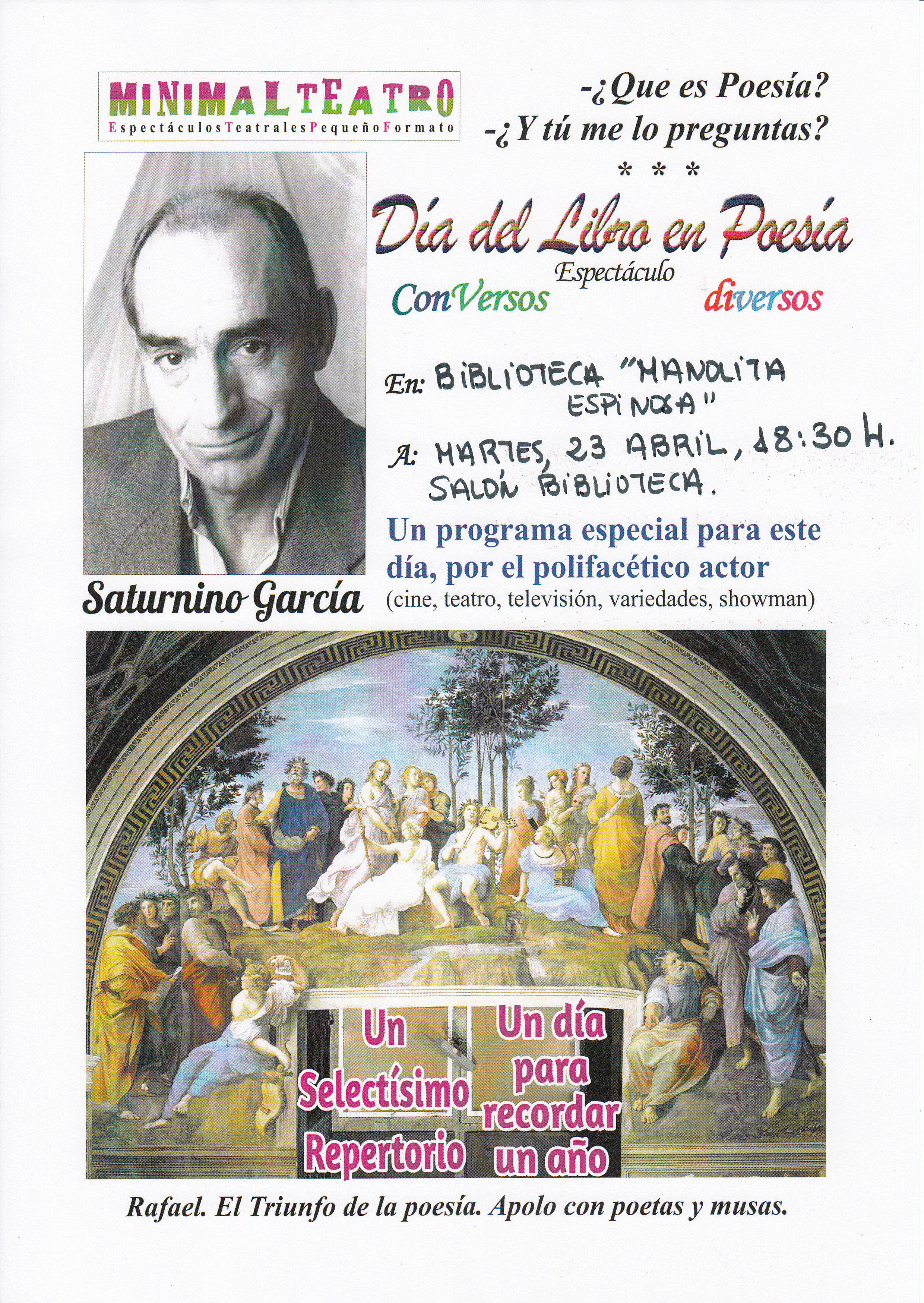 Saturnino García celebra hoy con los almagreños el Día del Libro. Con versos diversos, el actor a las 18:30 horas recitará poesías de varios autores. Saturnino Garcia, vinculado a Almagro, desde hace varios años, ha participado en eventos culturales y literarios. Hoy, vuelve a la Biblioteca Municipal.