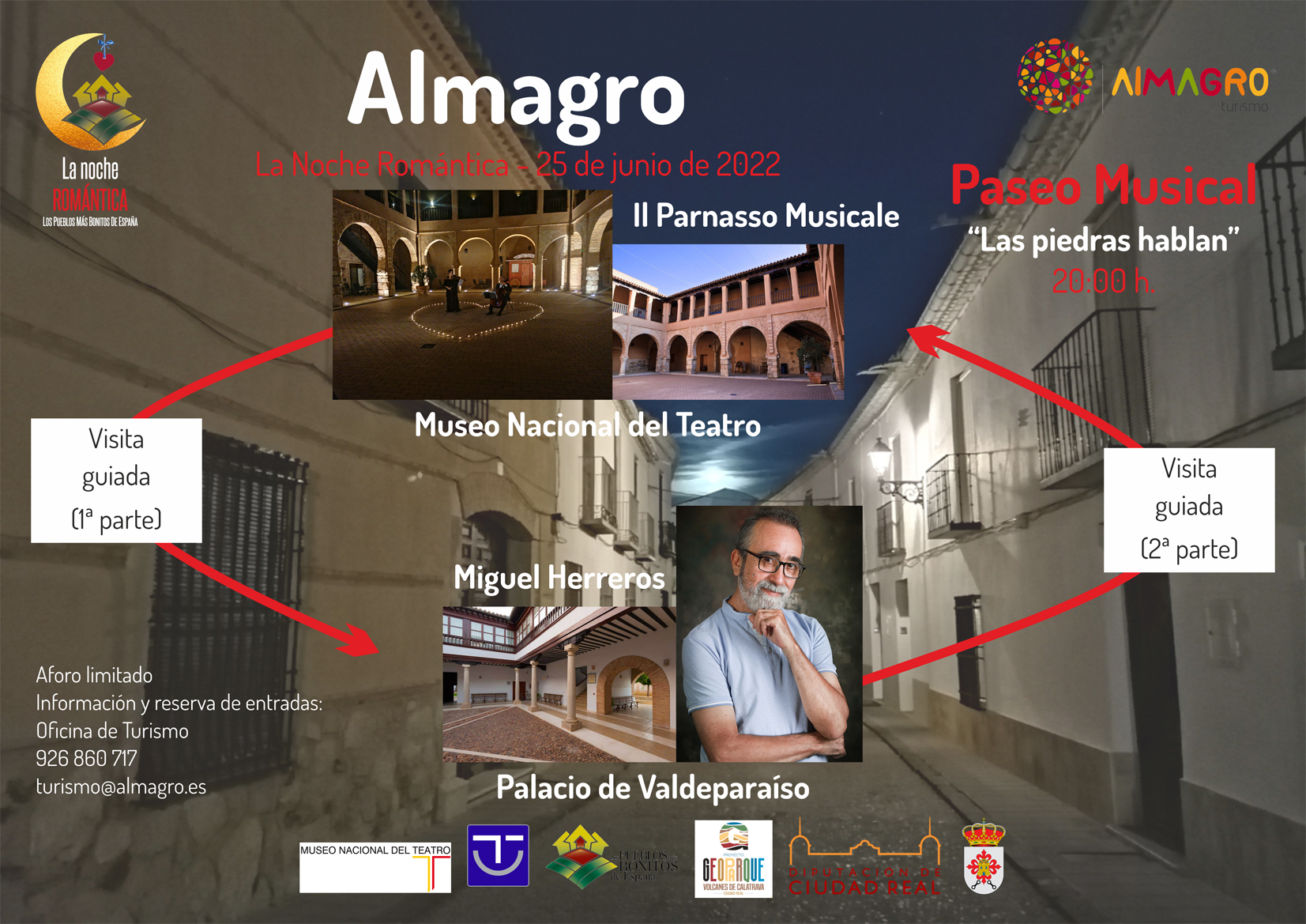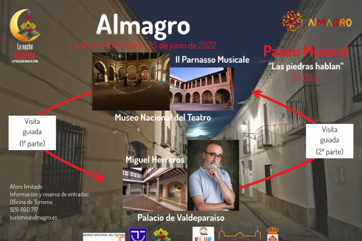 La primera actividad tiene como protagonista la música. El guitarrista Miguel Herreros y la agrupación Il Parnasso Musicale ofrecerán un espectáculo en dos escenarios: El Patio del Museo Nacional del Teatro y el Palacio de los condes de Valdeparaíso. Como en la edición pasada, el Ayuntamiento ha organizado un paseo guiado por las portadas más emblemáticas de la ciudad que finalizará en estos dos espacios. La visita programada a las 20h, es gratuita, previa inscripción en turismo@almagro.es o por teléfono 926.86.07.17.