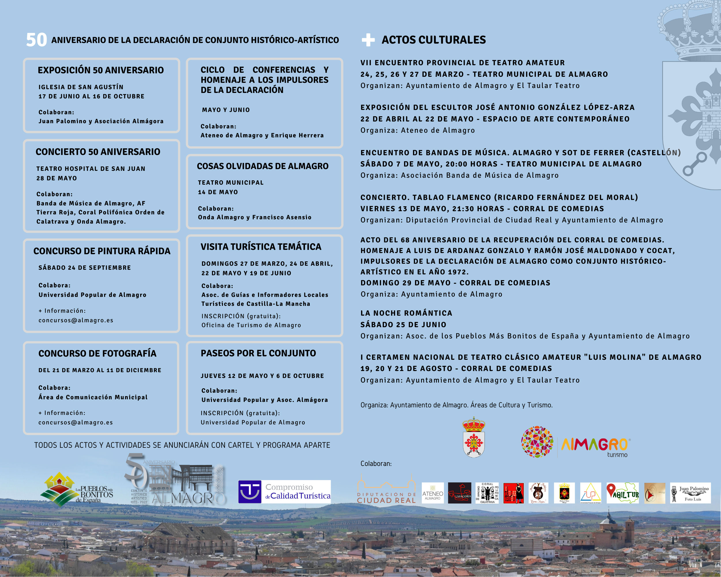 Del conjunto de actos, Marián Ureña ha destacado la exposición dedicada al 50 aniversario en la que el visitante podrá ver el Almagro del siglo pasado y el actual. Con la colaboración del fotógrafo almagreño, Juan Palomino que tiene un amplio archivo fotográfico propio y de su padre Luis y la asociación Almágora, se descubrirá en una misma imagen el antes y el después de sus calles, edificios históricos, plazas... cómo ha evolucionado el conjunto histórico de la ciudad. La iglesia de San Agustín será la sede de esta exposición que se desarrollará del 17 de junio al 16 de octubre.