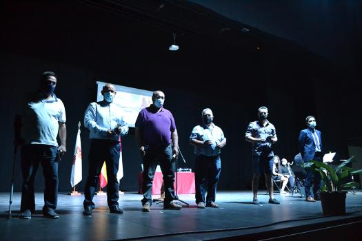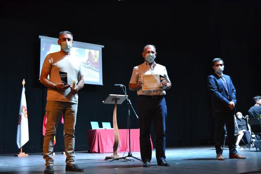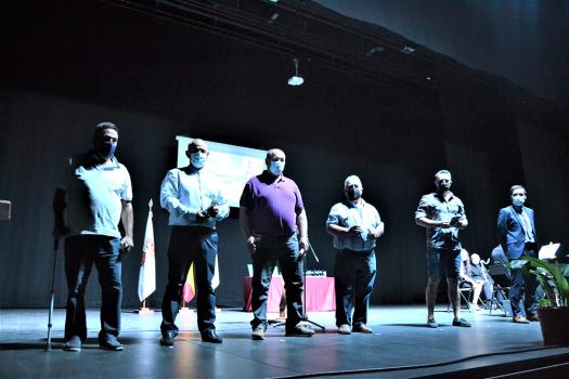 Los reconocimientos continuaron con otro de los colectivos que fueron imprescindibles en los primeros meses de COVID, los agricultores. Concretamente, cinco agricultores realizaron las tareas de desinfección de las calles, poniendo a disposición del ayuntamiento sus tractores y su tiempo. Santos Ruiz Roldán, Luis González Mireno, Miguel Valencia Rabadán, José Antonio González Rincón y Miguel Prieto Ureña subieron al escenario y hablaron en nombre de todos ellos. Como dijo el alcalde, fueron otros muchos quienes se ofrecieron a colaborar de manera altruista. Luis González, en nombre de todos ellos, señaló que lo volverían a hacer y que cada semana que salía con su tractor por las calles vacías de Almagro pensaba que lo hacía por todo el pueblo pero en especial por los mayores.