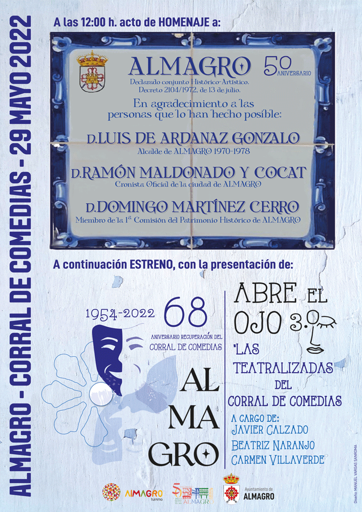 Con motivo de la celebración del 50 aniversario de la declaración de Almagro como Conjunto Histórico-Artístico, y aprovechando la fecha en la que se cumplen 68 años de la recuperación del Corral de Comedias, se llevará a cabo un acto de homenaje a D. Luis de Ardanaz Gonzalo, D. José Ramón Maldonado y Cocat y D. Domingo Martínez Cerro, impulsores de esta declaración. El acto tendrá lugar el próximo domingo, 29 de mayo, a las 12:00 horas en el Corral de Comedias.