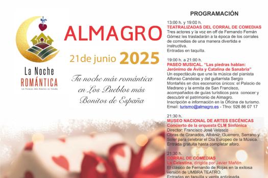 Almagro, 16 de junio de 2025 – El próximo sábado 21 de junio, Almagro, uno de los Pueblos más Bonitos de España, acogerá una nueva edición de La Noche Romántica, una velada mágica que une cultura, patrimonio y emoción en una experiencia inolvidable para vecinos y visitantes.
