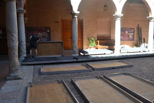 Un síntoma más que el Festival está cerca son los conocidos como “hombres de negro”. La imagen de los técnicos vestidos con camiseta negra con el logotipo del Festival Internacional de Teatro Clásico invaden las calles de la ciudad, cada año, antes y durante la cita teatral. Hoy, los primeros de este gran grupo están en el conocido como Patio de Fúcares, uno de los escenarios del Festival.