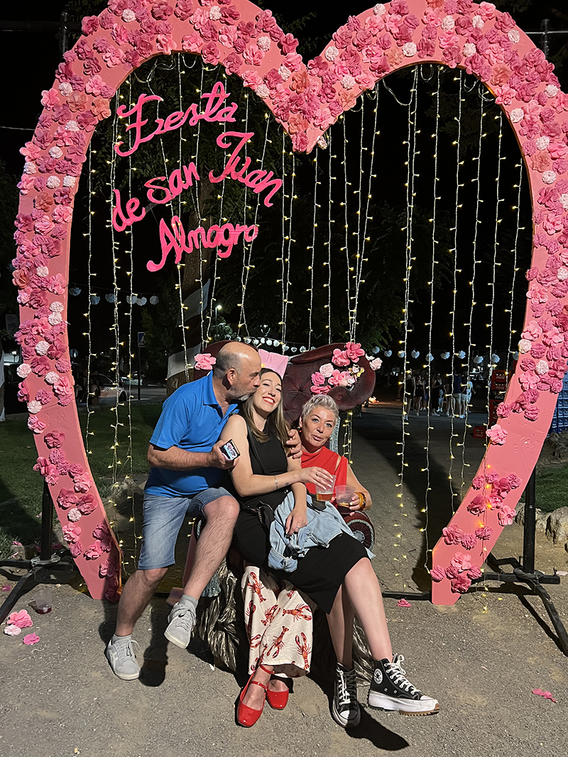 A esa misma hora, otros tantos almagreños y turistas se unían al beso más romántico en la verbena de san Juan, que, desde hace varios años, se suma a esta iniciativa de los pueblos más bonitos de España y decora la explanada de su ermita para el evento. Ayer, un gran corazón rosa con luces se convirtió en el lugar más fotografiado de la noche.