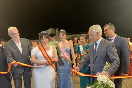 La jornada continuó con la inauguración oficial de la Feria 2025 en el recinto ferial. La comitiva, acompañada por la banda de música y los gigantes y cabezudos, se trasladó hasta la entrada del recinto, donde la reina y damas realizaron el tradicional corte de la cinta, que dio paso al encendido de las luces de la portada y fuegos artificiales.
