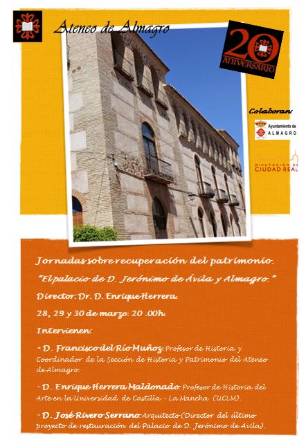 Francisco del Río intervendrá el jueves para poner en contexto cómo era el Almagro de finales del XVI, cuando el matrimonio formado por Jerónimo y Catalina encargó la construcción del edificio, ofreciendo una conferencia titulada «El Almagro de D. Jerónimo de Ávila». El viernes será Enrique Herrera quien diseccionará toda la historia y significado del palacio en su conferencia titulada «El palacio de D. Jerónimo de Ávila en Almagro. Imagen y símbolo». La tercera conferencia que cerrará el ciclo en la noche del sábado, correrá a cargo del arquitecto responsable del último proyecto de restauración del palacio, José Rivero Serrano. Su exposición se titulará «Medrano/Almagro: piedra, cielo, laberinto». Las tres conferencias darán comienzo a las 20 horas, con acceso libre en la sede del Ateneo de Almagro.